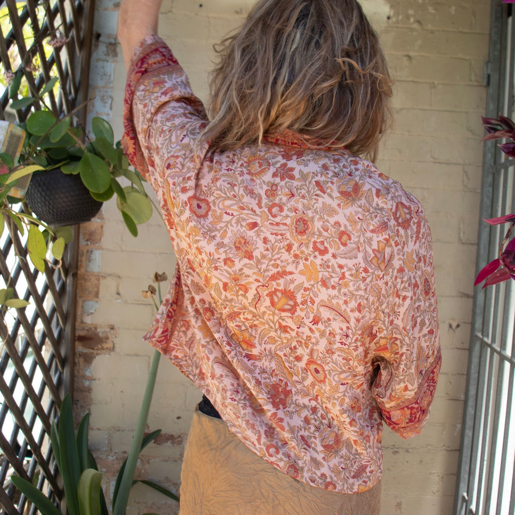 Featuring three-quarter sleeves and falling to the hips, our short kimono instantly transforms any outfit. Wear loose or tied in front. Made from vintage sari silk, each kimono is one of a kind.