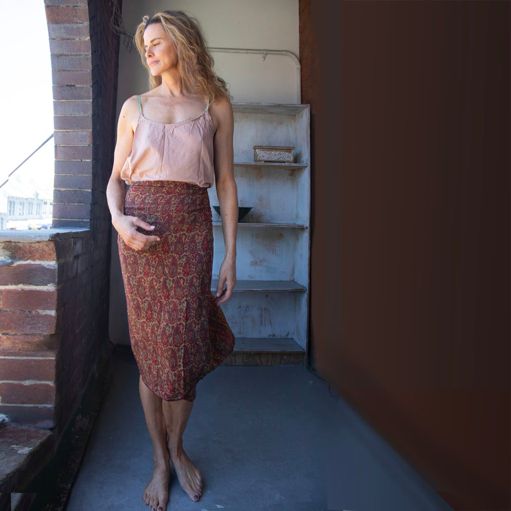 Our popular Silk Wrap Skirt is back for summer... Made from repurposed vintage sari silk, each skirt is one of a kind and will take you from the beach to dinner!