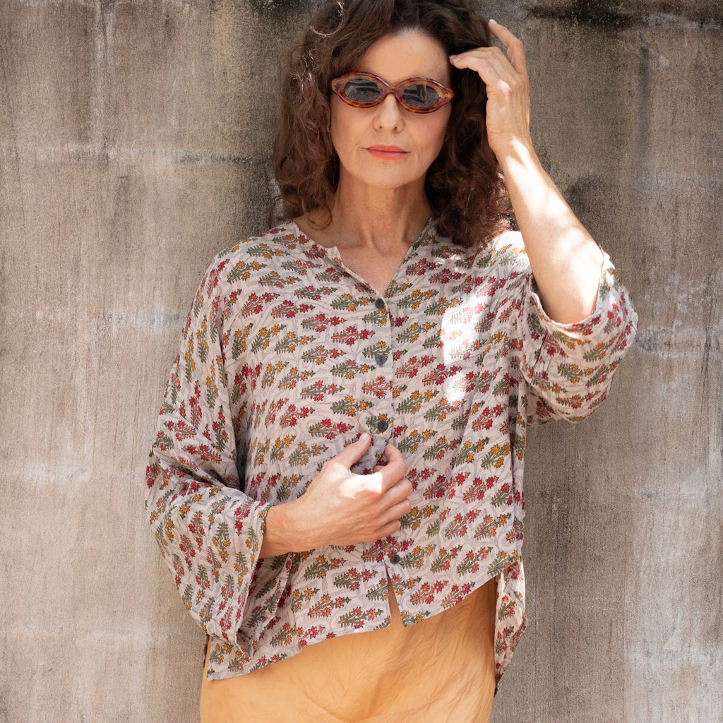 Made from vintage silk saris, our gorgeous new shirt features a round neck with button-down front and loose three-quarter sleeves... Each shirt is one of a kind.